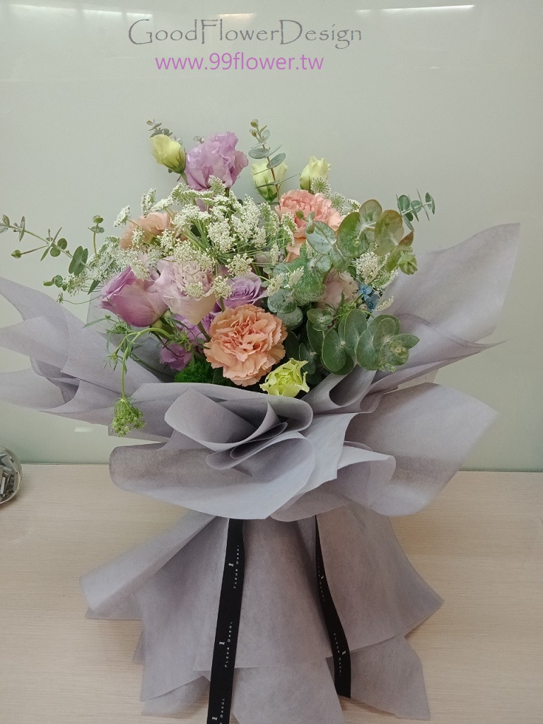 花材顏色為受歡迎的鮭魚粉, 杏粉,奶茶色突顯氣質優雅女士小姐們高約60公分包裝能選,如要選包裝需來電洽詢
