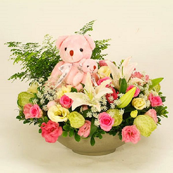 《花材》 百合、玫瑰、唐棉、七里香、蕾絲花、鐵線蕨、洋桔梗、母子熊。
