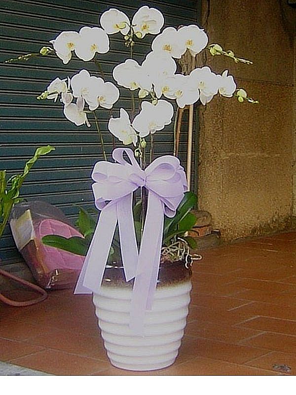 《花材》白花黃心蝴蝶蘭7株.陶瓷花器。