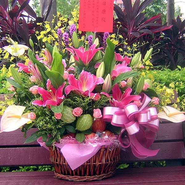 《花材》蘋果.紅百合.玫瑰.文心蘭.火鶴.葉材.籐籃.綉線。