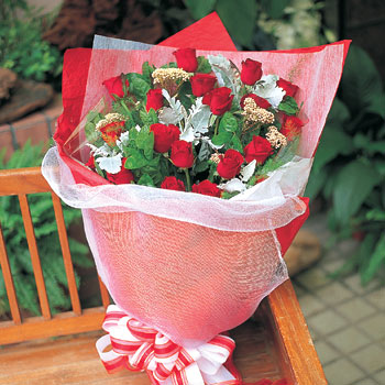 《花材》紅玫瑰、茉莉葉、綠色葉材。