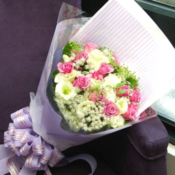 《花材》11朵紫玫瑰、洋桔梗、蕾絲花。