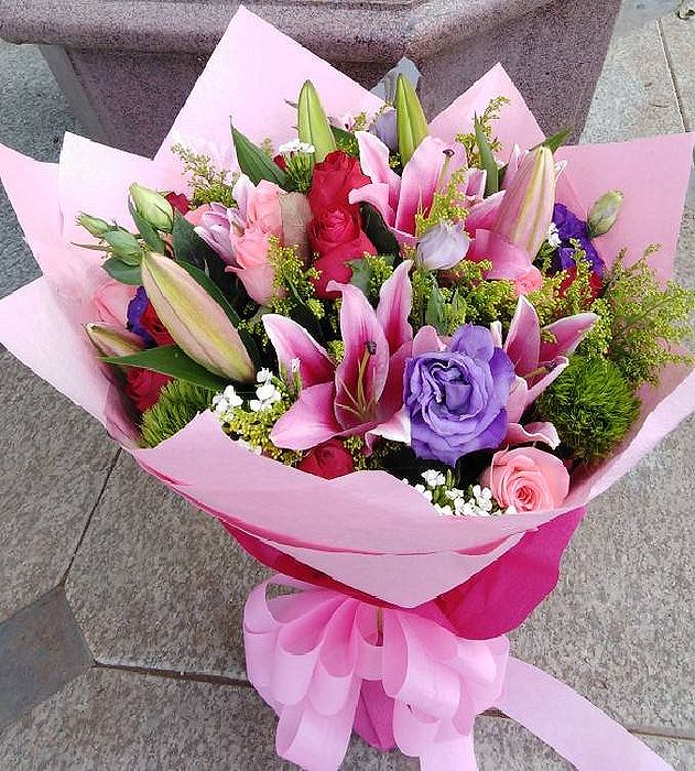 《花材》紅百合.桃紅玫瑰.粉玫瑰.紫桔梗.麒麟草.深山櫻.