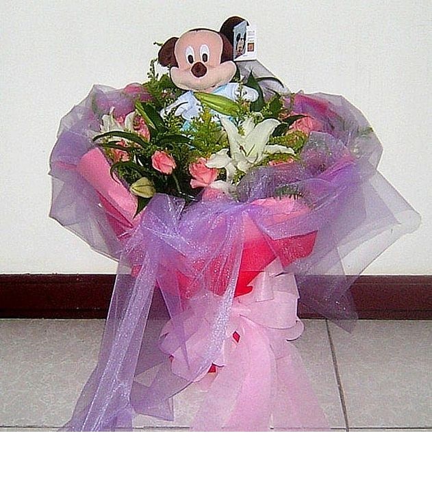 《花材》米奇玩偶1隻.香水百合3枝.特級黛安娜玫瑰11朵.麒麟草.葉材.進口雪紗