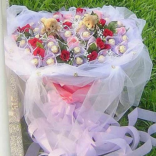 《花材》金莎36朵套紗.人造玫瑰花.泰迪熊2隻.週圍紗