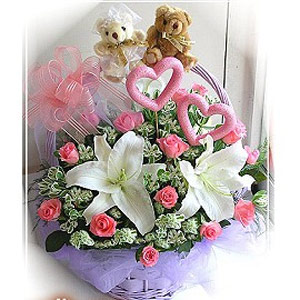《花材》香水百合+粉玫瑰20朵+粗血草+1對幸福小熊.盆花包裝