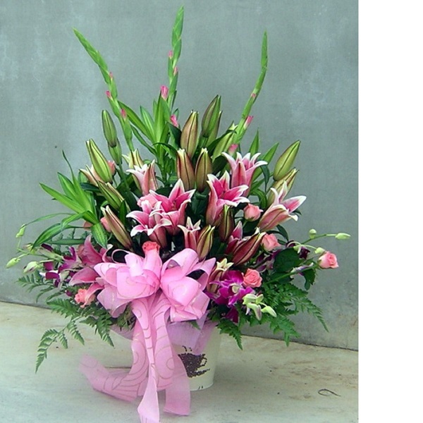 《花材》劍蘭.紅香水百合、石斛蘭.百合竹、玫瑰、葉材.花器