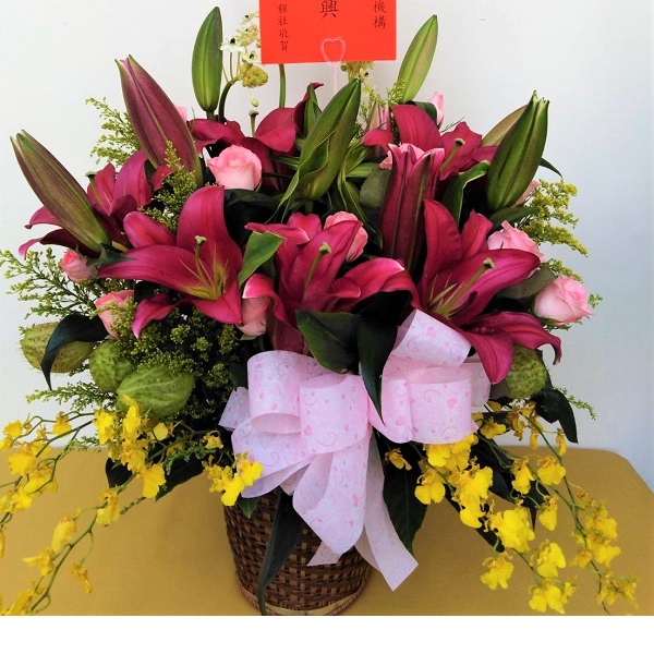 《花材》伯利恆之星.紅香水百合、文心蘭.百合竹、玫瑰、葉材.花器