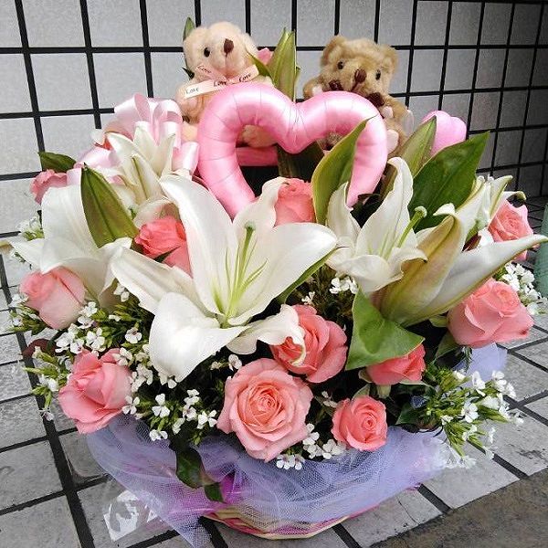 《花材》香水百合+粉玫瑰20朵+1對泰迪熊.盆花包裝