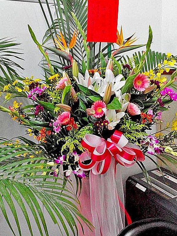 《花材》劍蘭.百合.太陽花.天堂鳥.文心蘭.小菊花.葉材。