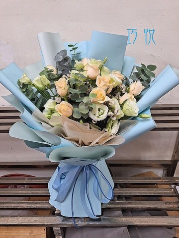 明亮的黃玫瑰象徵歡樂與友情,尤加利葉帶來自然清新的氣息,搭配高雅的桔梗,整束花束洋溢著活力與希望。深藍色包裝襯托出鮮豔的花色,沉穩中帶著亮眼的視覺焦點。