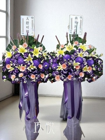 以白、紫、綠等素雅色系花材為主,呈現莊重與尊敬之意。搭配高架設計,花型挺立,象徵對逝者最高的敬意與深切的懷念。