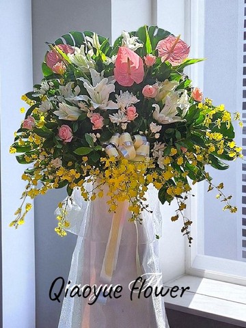 • 花材:粉玫瑰、文心蘭、天堂鳥、百合、葉材