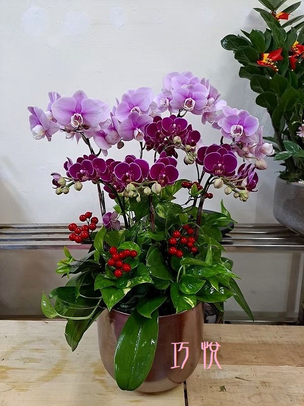本款蘭花盆栽精選蝴蝶蘭雙色品系,花姿優雅綻放,搭配紅果植栽與翠綠葉材,整體色彩和諧、層次分明,展現大方、喜氣與好運的氛圍。