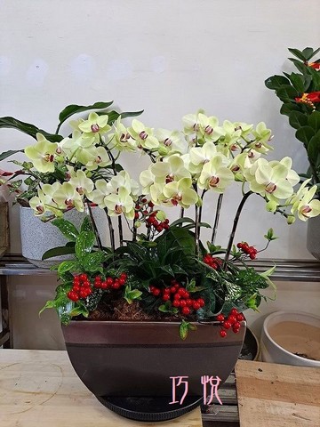 本款蘭花盆栽精選蝴蝶蘭品系,花姿優雅綻放,搭配紅果植栽與翠綠葉材,整體色彩和諧、層次分明,展現大方、喜氣與好運的氛圍。