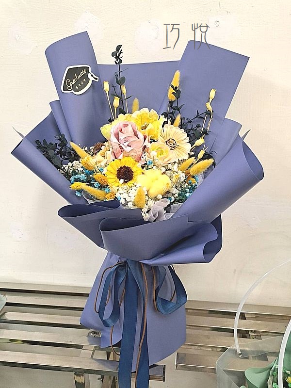 以深藍色質感包裝紙包覆整束花材,搭配明亮溫暖的黃色系乾燥與永生花,構成層次豐富、視覺鮮明的高質感花束。整體氛圍沉穩內斂中帶著正向能量,適合送給成熟穩重或理性內斂風格的對象。