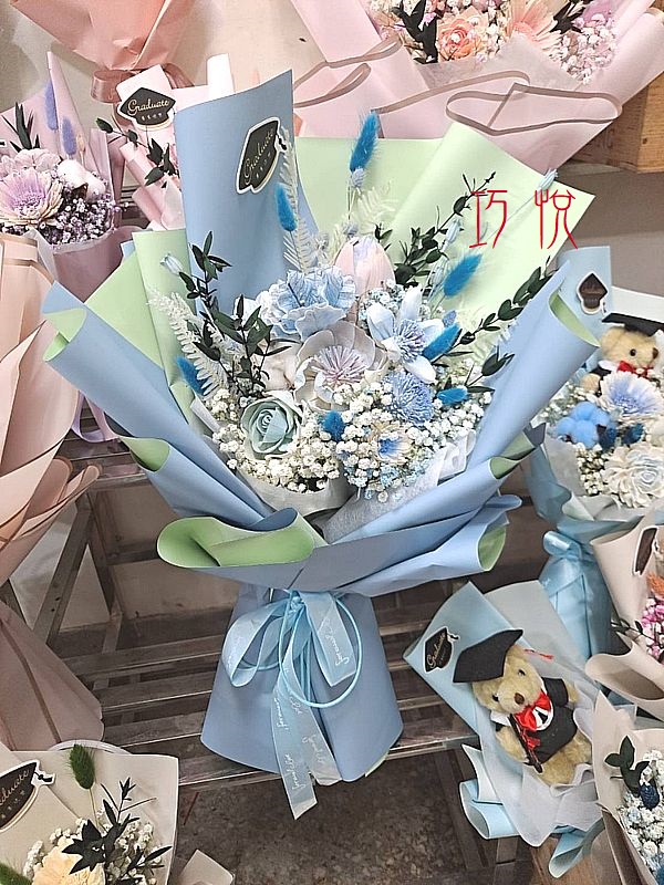 在藍與綠之間,找回內心的平靜與清爽。這款藍綠色系乾燥永生花,運用沉靜的藍玫瑰搭配乾燥繡球、棉花與自然系葉材,帶來森林系氛圍與低飽和質感,適合中性審美或喜愛清新自然風格的顧客。