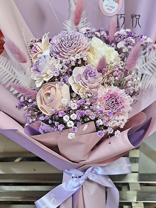 一束屬於紫色愛好者的夢幻花語,以層次豐富的紫色系乾燥與永生花材為主體,如星辰微光閃耀在靜謐夜空。精選霧面紫系包裝紙包覆,是一份兼具視覺與情感層次的質感花禮。