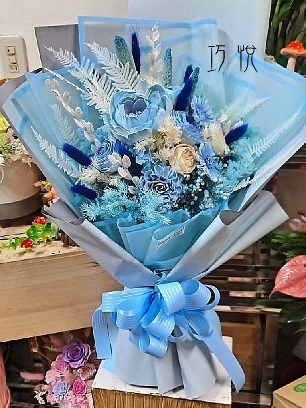 🎀 設計重點:冷靜藍,是沈穩而高雅的象徵。這款藍色花束,呈現出如海般深邃、天空般自在的氛圍,適合送給獨立堅強的她,也適合收藏自己的寧靜時刻。