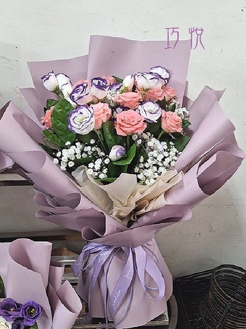 白玫瑰外緣描繪淡紫色暈染,彷彿夕陽下的暮光邊界,典雅神秘;粉桔梗柔和溫婉,象徵靜靜守護的心意;點點滿天星如輕語般妝點其間,讓整束花散發出恬靜又不平凡的氣息。是一份專屬於優雅靈魂的花語詩。