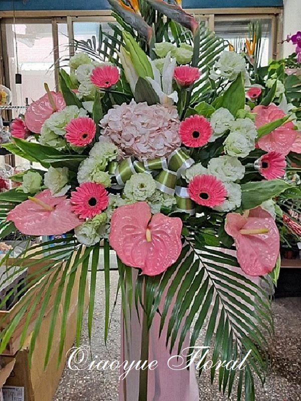 • 花材:綠結梗、粉火鶴、粉太陽花、白百合、粉繡球花、天堂鳥、葉材