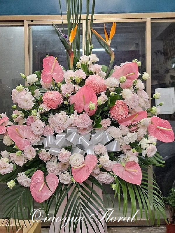 • 花材 : 牡丹菊、粉火鶴、綠結梗、白百合、粉繡球、天堂鳥、葉材