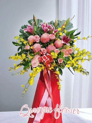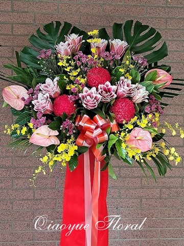 精選新鮮亮眼花材,層次豐富、配色大器,搭配高架設計,展現挺拔氣勢與祝賀誠意。