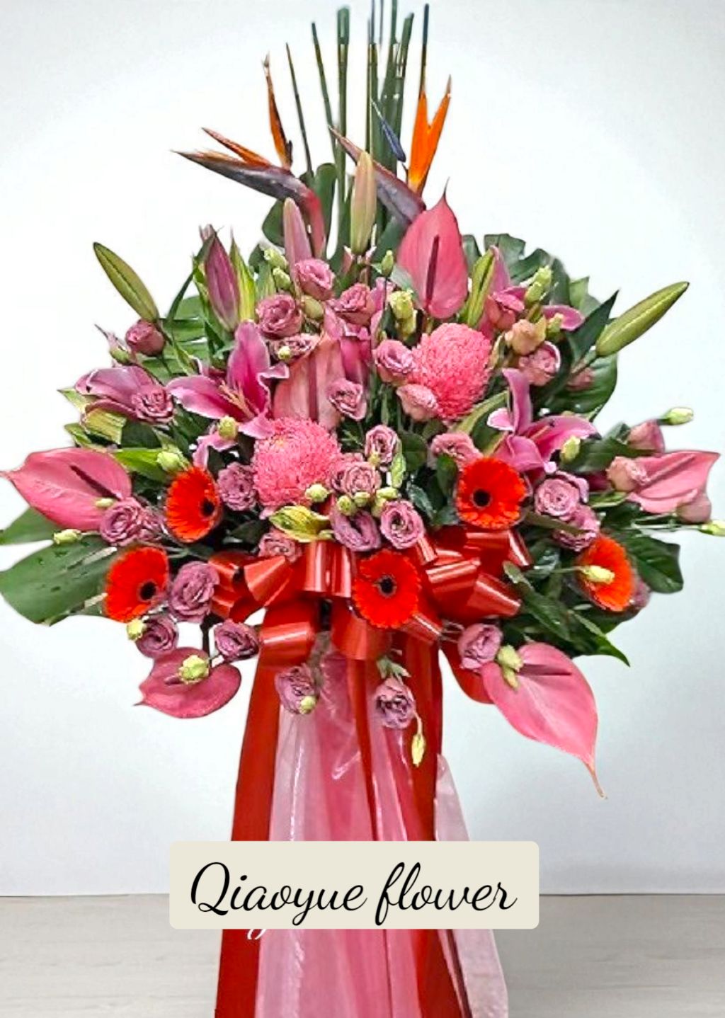 • 花材:粉火鶴、粉繡球、百合、粉玫瑰、太陽花、天堂鳥、葉材