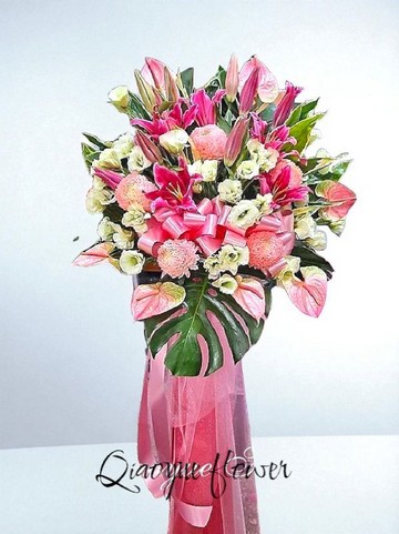 • 花材:牡丹菊、百合、玫瑰、粉火鶴、葉材