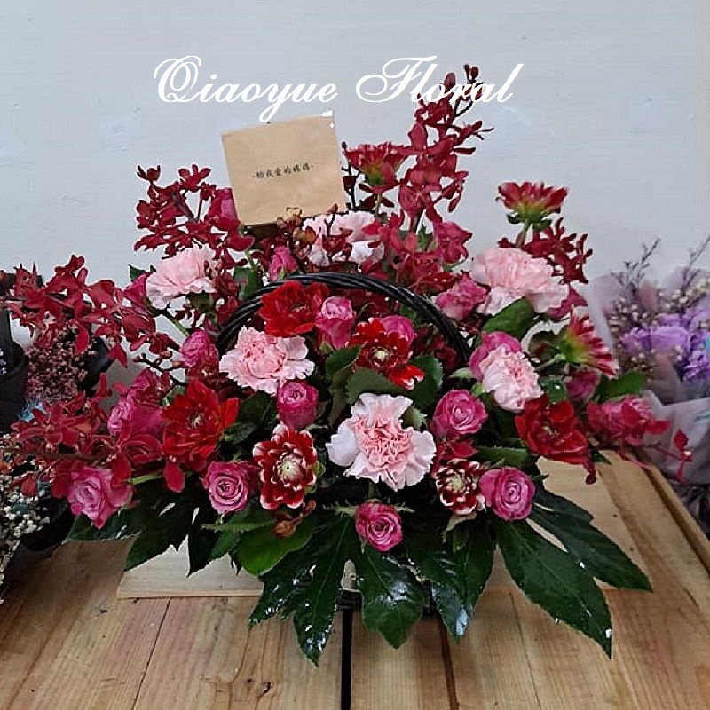 紫紅玫瑰、粉色大康、紅大理花、曼谷、葉材