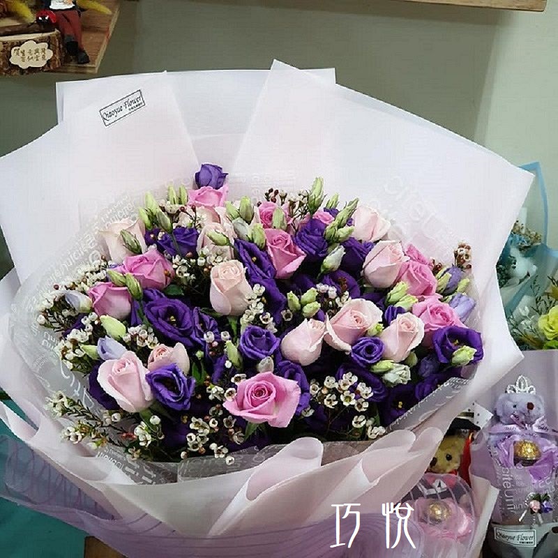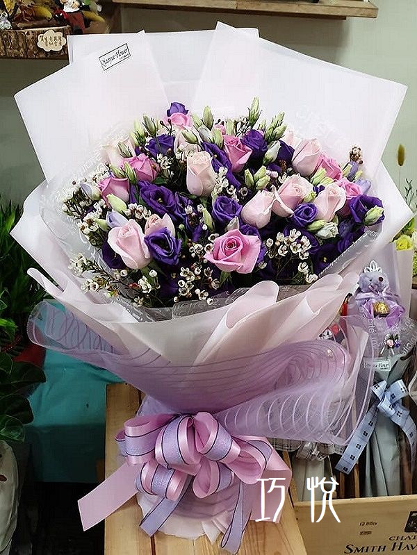 • 花材:白色滿天星、紫/粉玫瑰