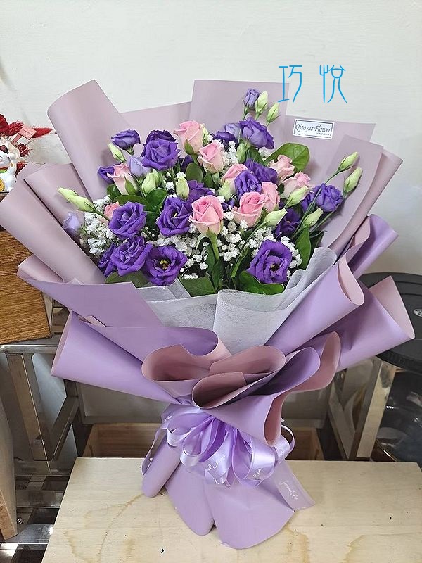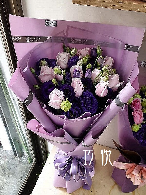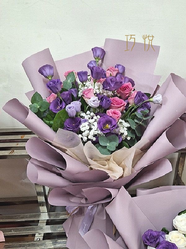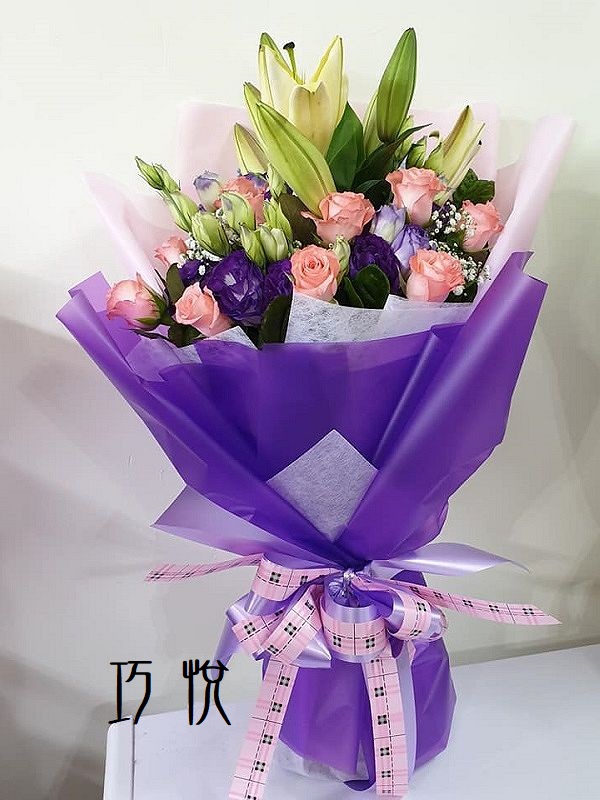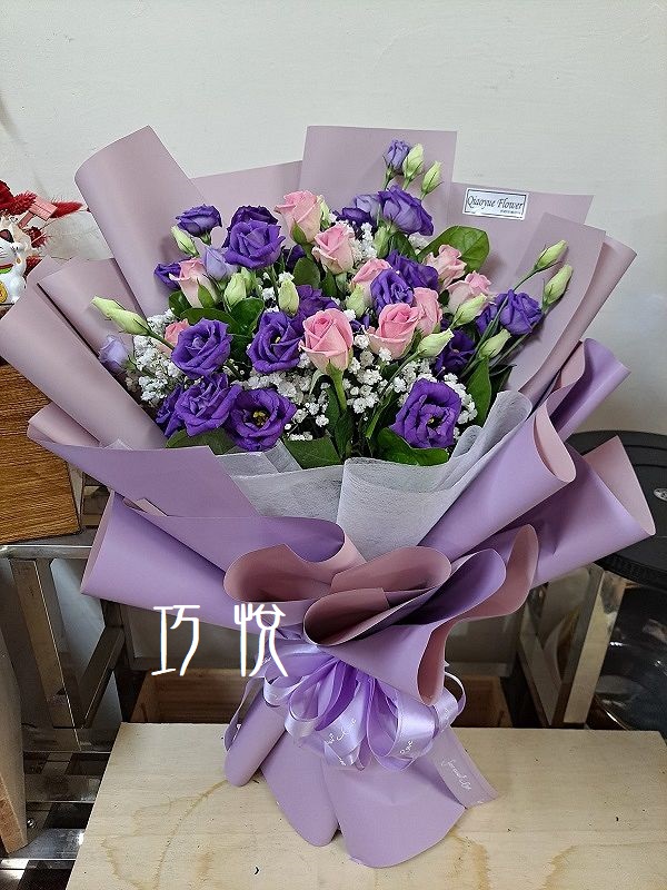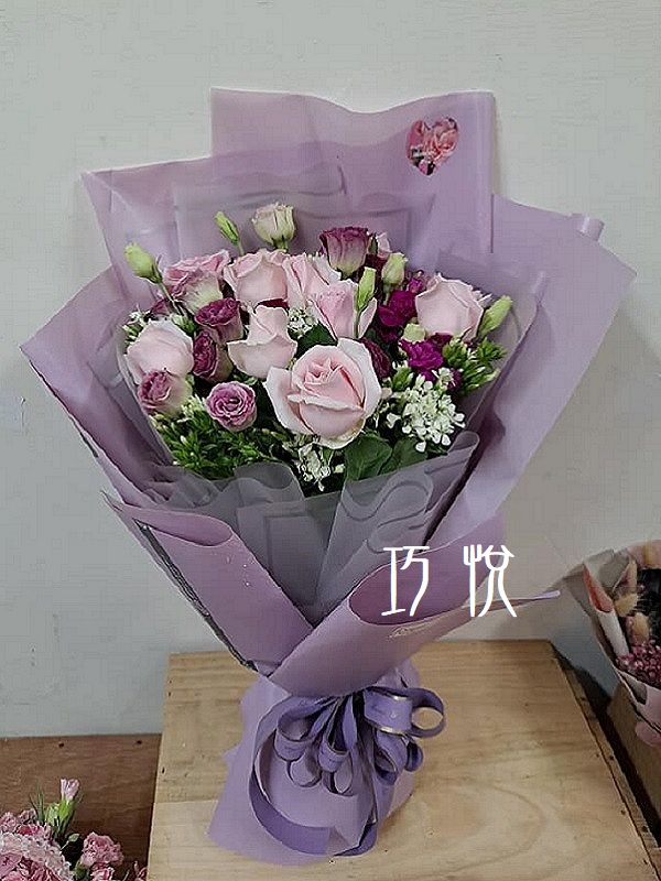 紫色包裝粉玫瑰花束|夢幻溫柔款
