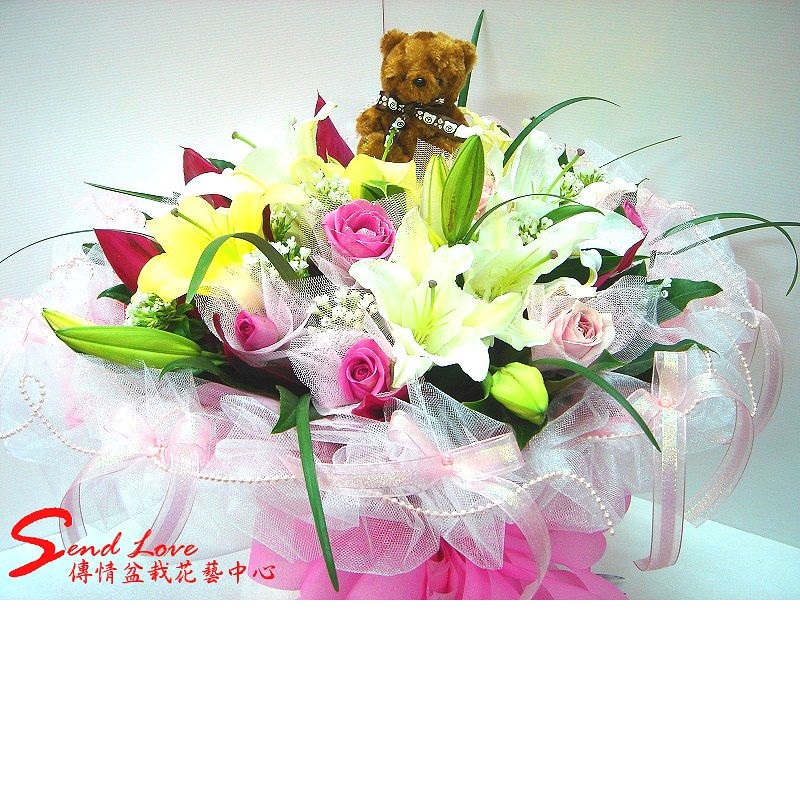 黃金百合+粉玫瑰花束