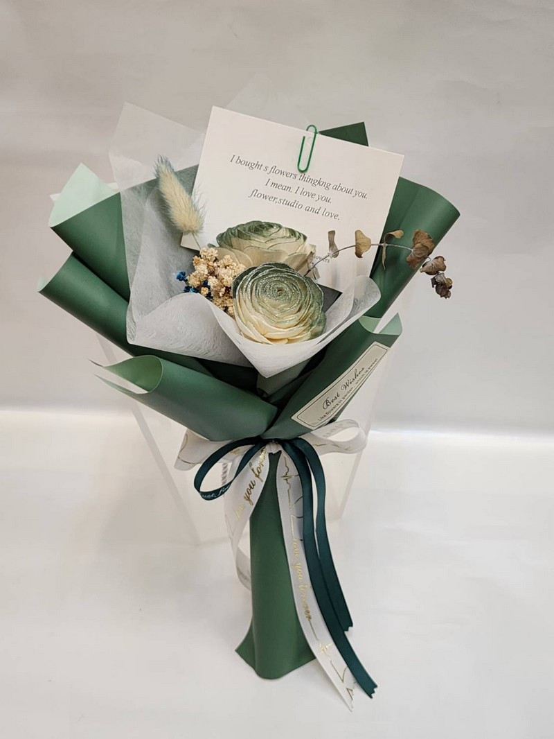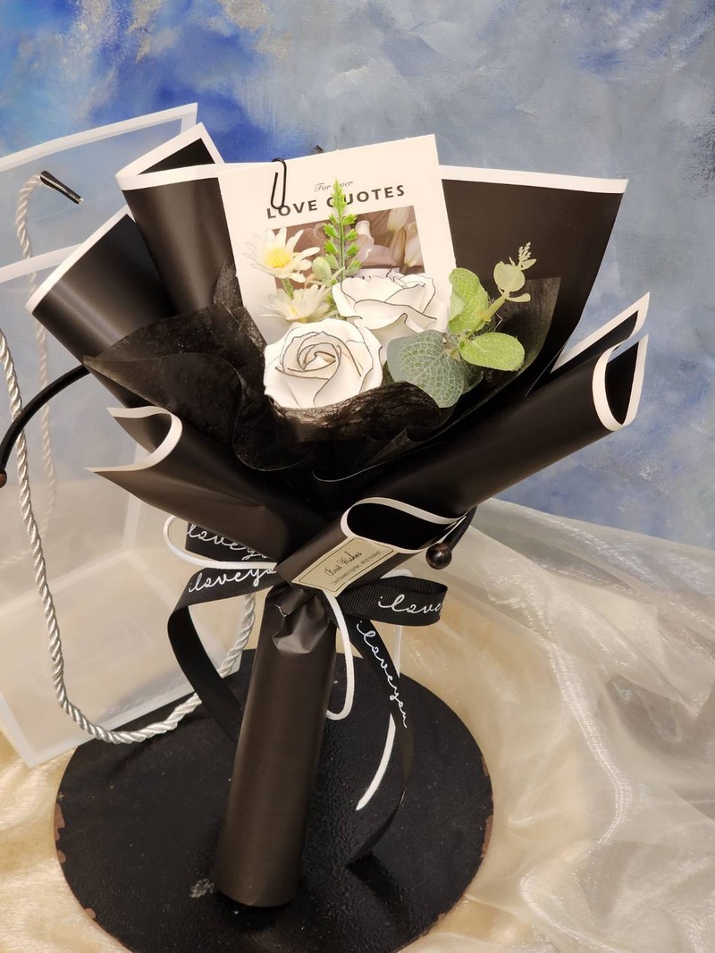 香皂花束 含提袋 花色、包裝紙顏色皆可客製化,歡迎詢問。 花的型態會依照季節時間變化,手工製作無法完全一樣,盡可能以圖片內呈現為原則。 花禮請於三天前預訂。 依照季節使用的花材有所不同,會用同等花材代替。 如需客製化,費用金額會上下浮動。 急單請來電洽詢,訂購花禮請加Line或來電。 香皂、乾燥花皆不能碰水。