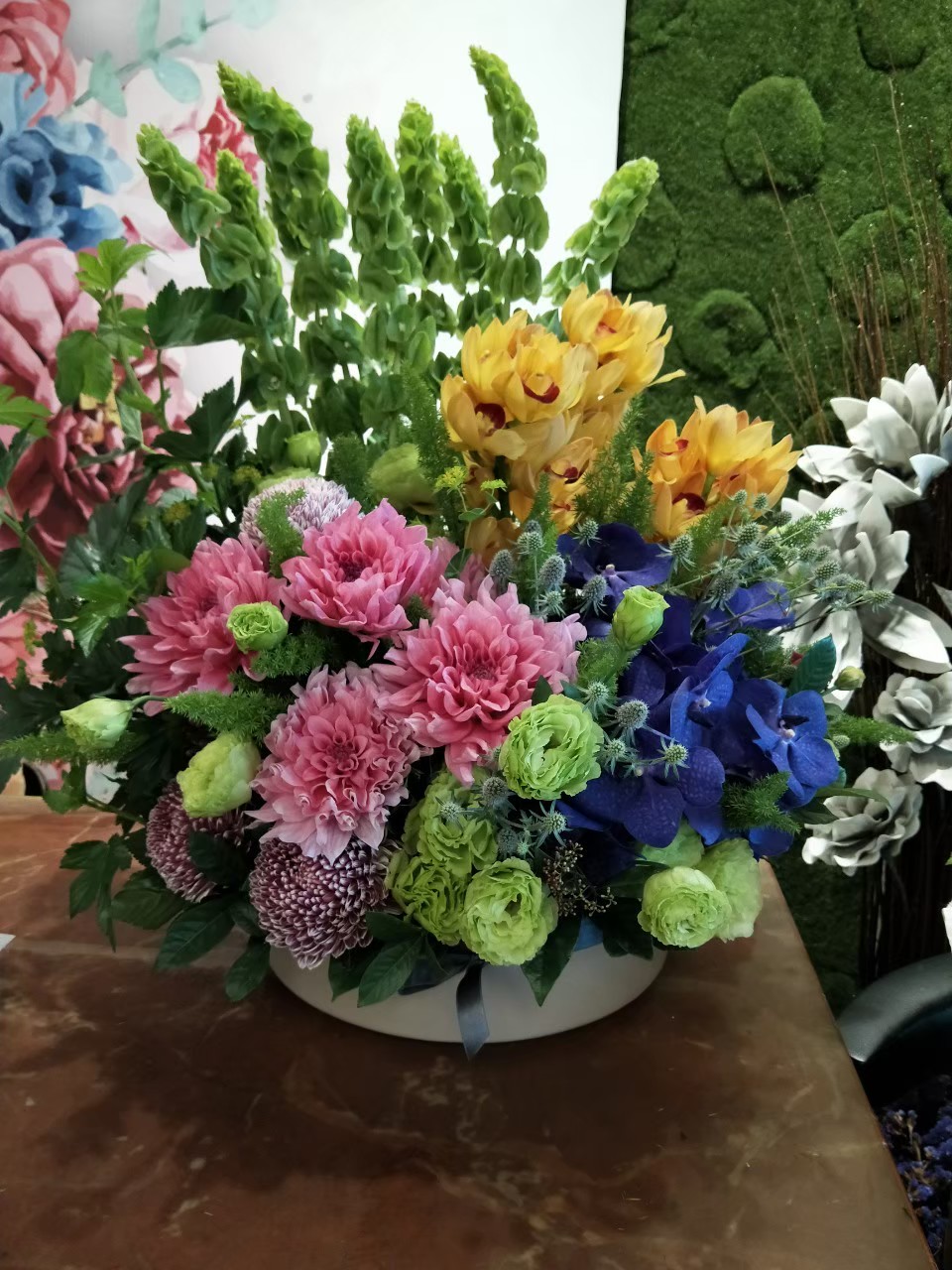 粉玫瑰+萬代蘭+東亞蘭+針墊花+桔梗+小松果+尤加利