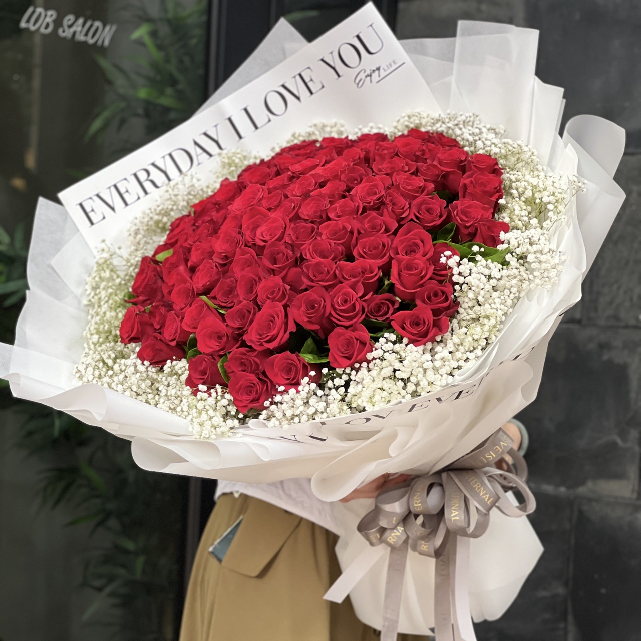 來自哥倫比亞/波蘭的進口大紅玫,可依照客戶喜好使用不同顏色的包裝紙包裝花束。