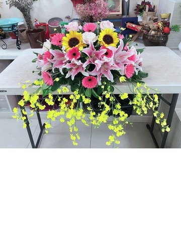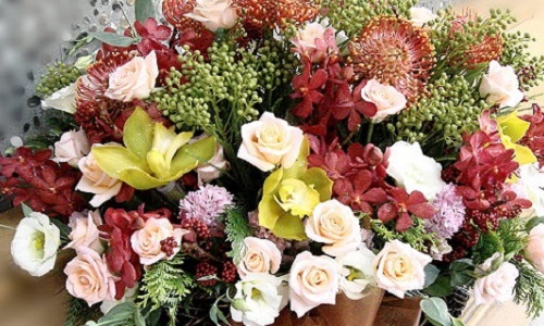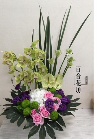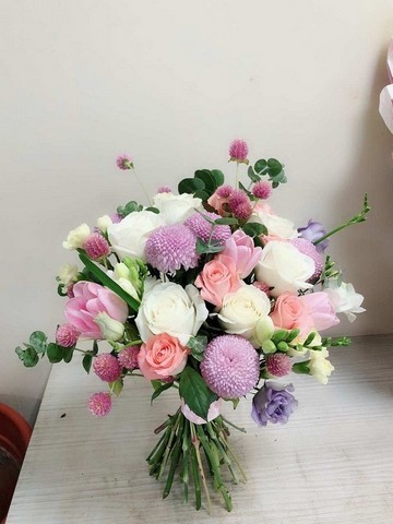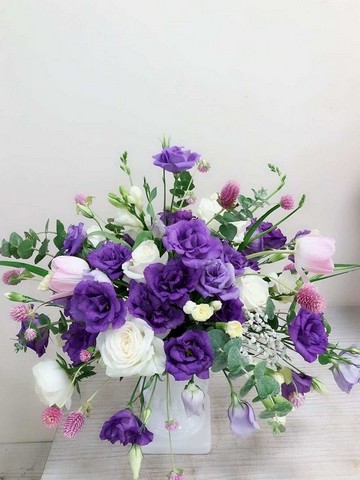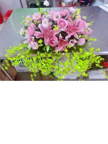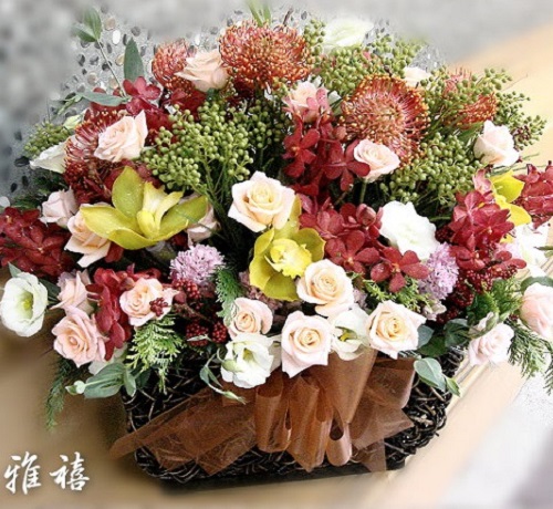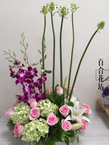 粉玫瑰+萬代蘭+東亞蘭+針墊花+桔梗+小松果+尤加利