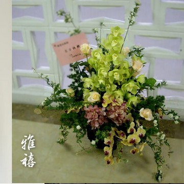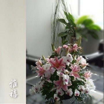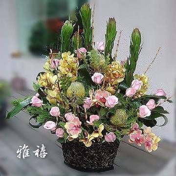 粉玫瑰+萬代蘭+東亞蘭+針墊花+桔梗+小松果+尤加利35cm x 40cm