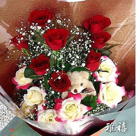 花材:紅玫瑰加上雙色玫瑰再加上滿天星及小熊。讚!!